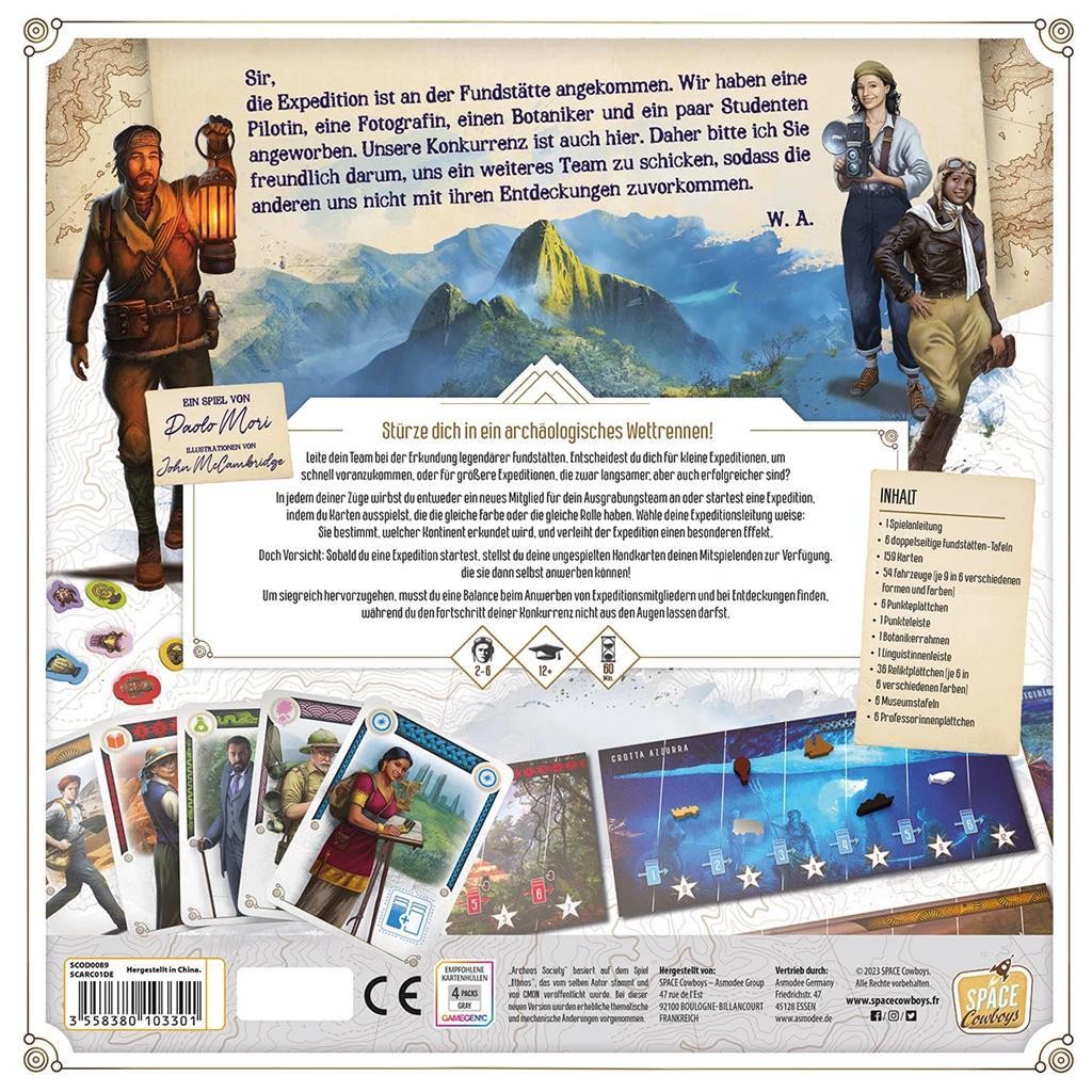 In Archeos Society schlüpfen die Spieler in die Rolle von konkurrierenden Archäologen, die ihr Expeditionsteam bei der Erkundung legendärer Fundstätten leiten. In jedem Zug wird ein neues Mitglied für das Ausgrabungsteam angeworben, oder eine Expedition von der Hand gestartet, indem Karten ausgespielt werden, die die gleiche Farbe oder die gleiche Rolle haben. Die oberste Karte bestimmt dabei, welcher Kontinent erkundet wird, und sie verleiht der Expedition einen besonderen Effekt. Um siegreich hervorzugehen, müssen die Spieler die perfekte Balance beim Anwerben von Expeditionsmitgliedern und bei Entdeckungen finden, während der Fortschritt der Konkurrenz nicht aus den Augen verloren werden sollte.