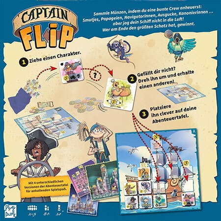 Im kurzweiligen Familienspiel Captain Flip ist es als Captains von Piratenschiffen eure Aufgabe, eine bunte Crew anzuheuern und die meisten Münzen zu sammeln. Dabei zieht ihr Plättchen mit Charakteren aus dem Beutel und platziert sie clever auf eurer Abenteuertafel. Ihr seid nicht zufrieden mit Smutjes, Papageien, Navigatorinnen, Augucken oder Kanoniererinnen? Dann könnt ihr durch den innovativen Flip-Mechanismus einmalig entscheiden, das Plättchen umzudrehen und einen anderen Charakter zu erhalten. Durch spannende Sofort-Effekte und Synergien könnt ihr das Beste aus eurer Crew herausholen – oder euer Schiff in die Luft jagen. Wer am Ende den größten Schatz hat, gewinnt!