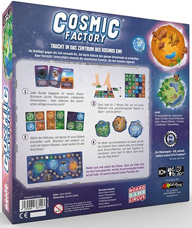 Entsprechend der Planeten in den drei Zonen eurer Galaxie sammelt ihr Punkte. Davon sahnt ihr besonders viele ab, wenn es euch gelingt, eine bestimmte Mindestanzahl Planeten in jeder Zone zu kombinieren. Doch aufgepasst, viele Punkte in nur einer Zone zu sammeln reicht nicht... denn am Ende geht ihr mit der Punktzahl eurer schwächsten Zone in die Schlusswertung. Behaltet bei Cosmic Factory einen kühlen Kopf und immer die richtige Balance, denn erst wer dann die meisten Punkte hat, gewinnt.