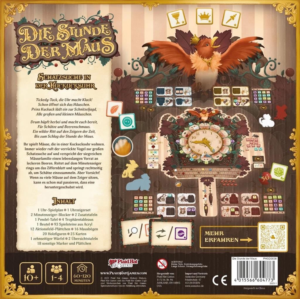 - Wunderschön illustriertes Spielmaterial, inkl. Holzmausfiguren, Acryl-Trophäen und drehbaren Uhrzeigern