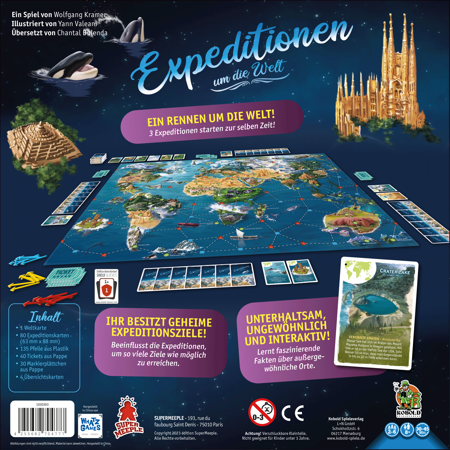 Expeditionen um die Welt ist ein Familienspiel für 2-6 Abenteurer ab 8 Jahren von Erfolgsautor Wolfgang Kramer (El Grande, Tikal, 6 nimmt!). Die Illustrationen zeichnet Yann Valéani.