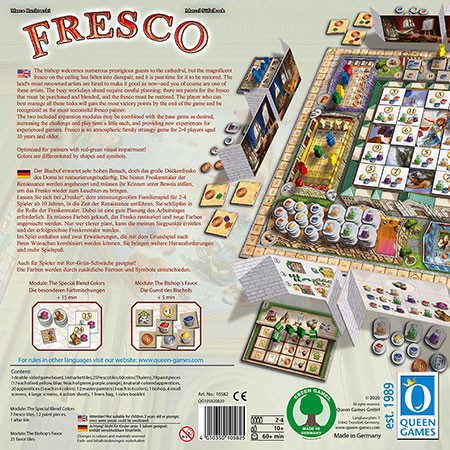 Das Spiel beinhaltet, neben dem Basisspiel, zwei Erweiterungsmodule. “Die besonderen Farbmischungen” und “Die Gunst des Bischofs”. Diese könnt ihr nach euren Wünschen mit dem Grundspiel kombinieren. Sie bieten neue Herausforderungen und verlängern die Spieldauer.