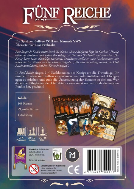 In Fünf Reiche ringen 2—4 Nachkommen des Königs um die Thronfolge. Ihr sammelt Karten, um Einfluss zu gewinnen, wertvolle Aufträge und Belobigungen zu erhalten und euch die Unterstützung der Stämme zu sichern. Wer dabei die Fähigkeiten der Charaktere clever nutzt und am Ende die meisten Punkte hat, gewinnt!