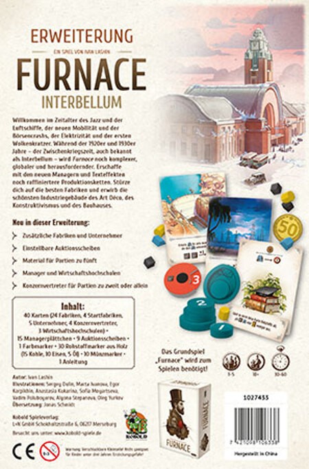 Willkommen in der Ära des Jazz, der Zeppeline, Börsencrashs, Elektrizität und den ersten Wolkenkratzern. In dieser Erweiterung für Furnace findet ihr neue Fabriken, neue Unternehmer, neue Fähigkeiten, Managerplättchen, variable Auktionsscheiben, Material für eine 5. Person und neue Agenten für das Solo- und 2-Personenspiel. Furnace: Interbellum ist in den Zwischenkriegsjahren der 1920er und 1930er angesiedelt - genannt Interbellum.