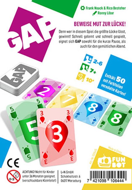 Beweise Mut zur Lücke! Denn wer in diesem Spiel die größte Lücke lässt gewinnt. Schnell gelernt und schnell gespielt eignet sich GAP sowohl für die kurze Pause, als auch für den gemütlichen Abend.