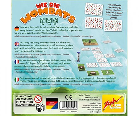 Wombats sieht man selten allein. Doch wo tummeln sich die wenigsten und wo die meisten? Gemeinsam schätzen die Spieler möglichst schnell und richtig, wo wie viele Wombats über Weiden wuseln. Dann legen sie alle Wombatkarten zu einem Muster aus, das die possierlichen Tierchen in aufsteigender Anzahl ihrer Häufigkeit nach auf den Karten zeigt. Zum Teamwork dazu gehört auch, die Sanduhr immer dann umzudrehen, wenn eine Minute mal wieder aus weniger Sekunden besteht, als man das so geschätzt hätte. Wie die Wombats ist ein temporeicher, kooperativer Augen- und Kopfverdreher, bei dem nichts so wenig ist, wie es scheint, aber vieles viel mehr, als es aussieht.